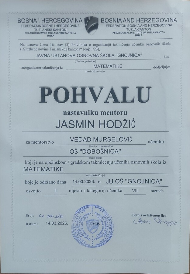Poseban uspjeh ostvario je učenik Murselović Vedad, koji je osvojio odlično drugo mjesto i time obezbijedio plasman na kantonalno takmičenje.